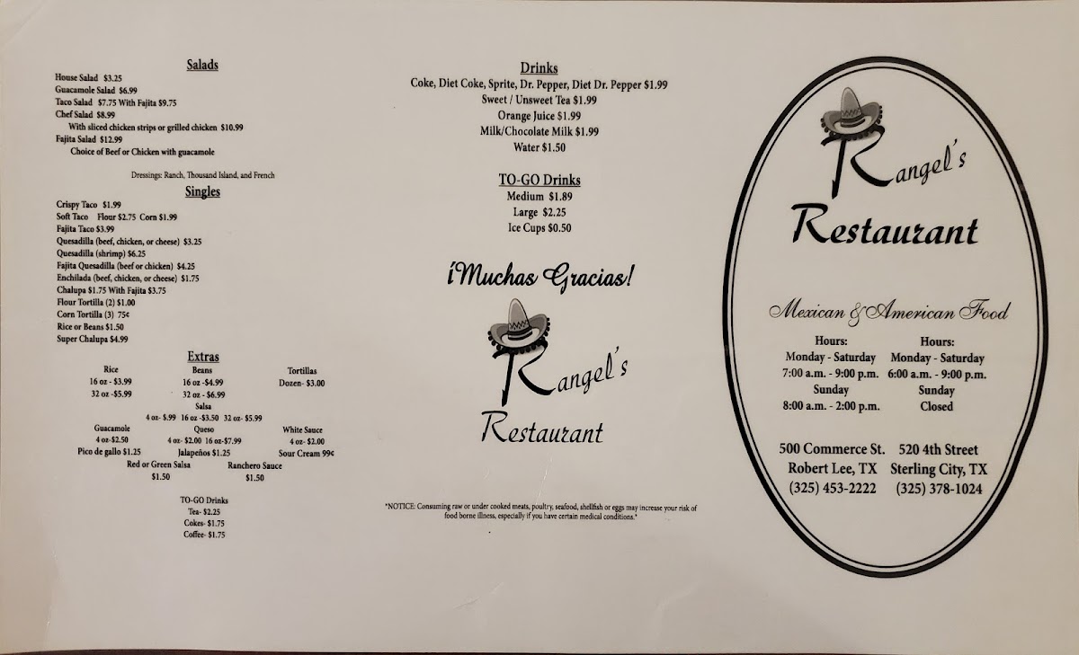 Rangel's Mexican Restaurant, located at 500 Commerce St, Robert Lee, TX 76945, offers a delightful variety of traditional Mexican dishes and comforting sides. The Salads section presents options like the House Salad, Guacamole Salad, and the more filling Taco Salad. For those craving something heartier, the Chef Salad and Fajita Salad are great choices.